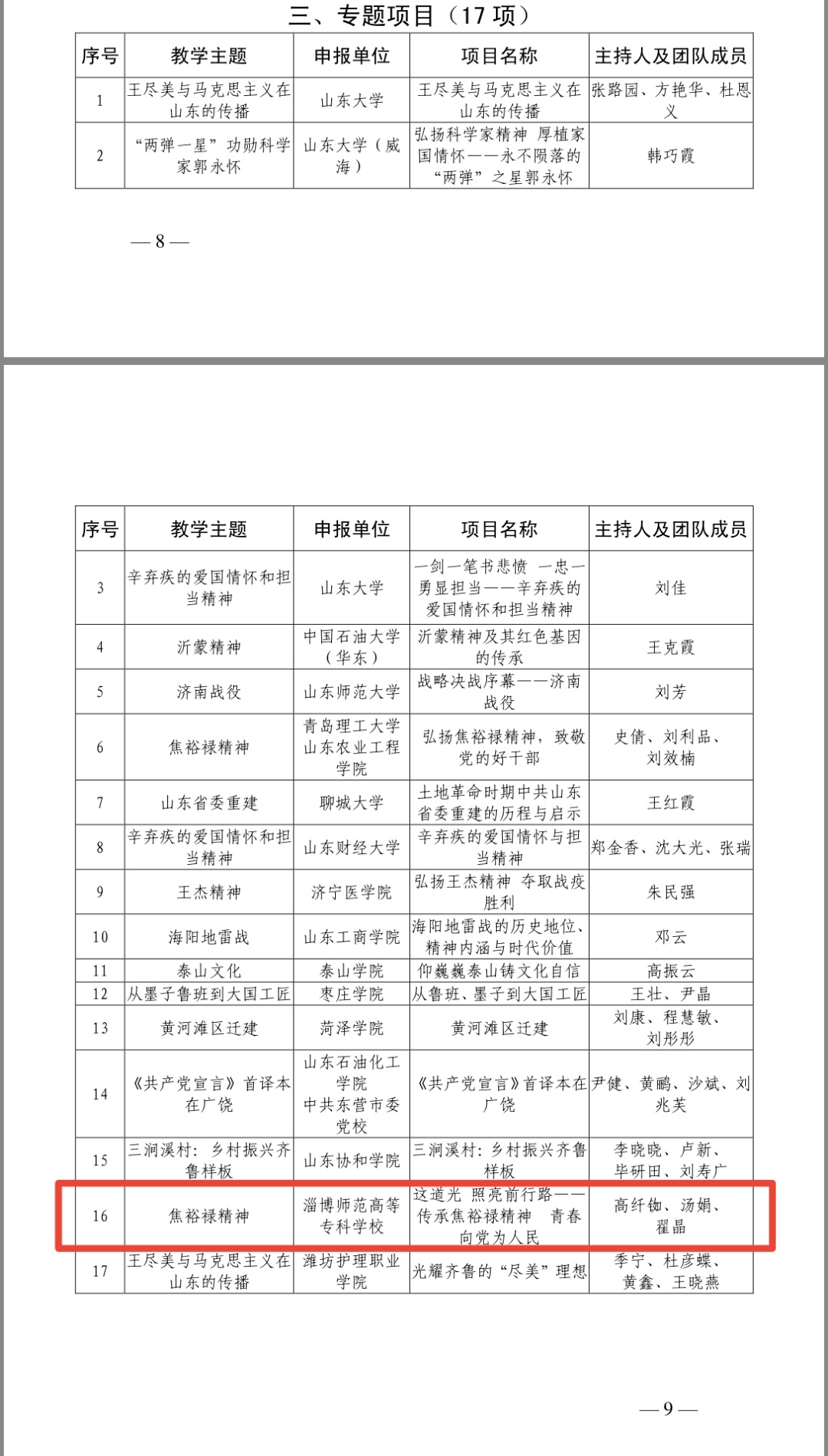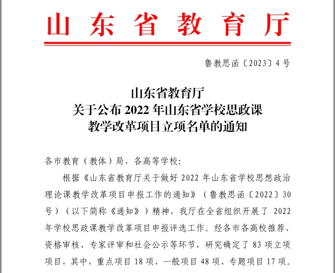 山东省学校思政课教改项目的研究与实践贯彻落实全国全省教育大会、高校思想政治工作会议和学校思想政治理论课教师座谈会精神的重要举措。此次,全省研究确定了83项立项项目,其中专题项目17,且前期需经过主题遴选、案例设计、教学展示、专家评审等环节,层层选拔后产生,难度较大。