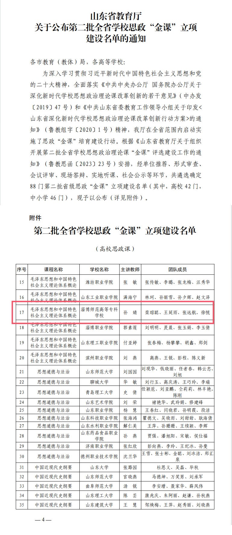 为贯彻落实习近平总书记关于教育特别是学校思想政治工作的重要论述,深入学习贯彻习近平新时代中国特色社会主义思想和党的二十大精神,全面落实《中共中央办公厅国务院办公厅关于深化新时代学校思想政治理论课改革创新的若干意见》(中办发〔2019〕47 号)和《中共山东省委教育工作领导小组关于印发〈山东省深化新时代学校思想政治理论课改革创新行动方案〉的通知》(鲁教组字〔2020〕1 号)精神,着力打造一批学生真心喜爱、终身受益的思想政治理论课,山东省教育厅自去年9月份组织开展新一轮全省大中小学思政课“金课”评选工作。经单位推荐、形式审查、会议评审、现场答辩、实地听课、社会公示等环节,从推荐报送的274门思政课中共评选出88门省级思政课“金课”,其中高校思政课42门。在本次“金课”的评选中,参评团队认真准备、反复打磨,顺利经过了“形式审查、会议评审、现场答辩、实地听课”四个环节,最终成功立项。
